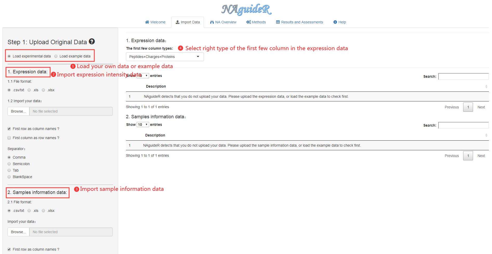 NAguideR supports four basic file formats (.csv, .txt, .xlsx, .xls). Before analysis, users should prepare two required data: (1) Proteomics expression data and (2) Sample information data. The data required here could be readily generated based on results of several popular tools such as MaxQuant, PEAKS, Spectronaut, and so on. Then can upload the two data into NAguideR with right formats respectively and start subsequent analysis.